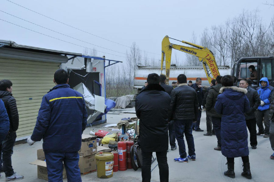 这次集中整治行动,共组织执法人员50余人,租用一辆挖掘机和一辆平板车。通过现场做工作,在保证人、财、物安全的前提下,对3座非法加油站(点)地面附属物(临时站点的营业用房、加油设施的顶棚等)进行了拆除,共拆除百余平方。