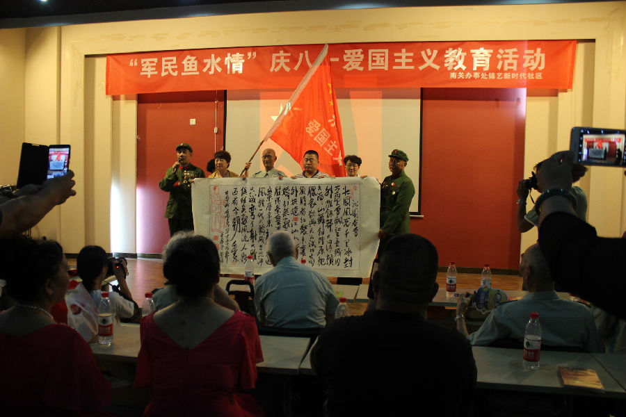 为进一步加强军民团结,在八一建军节即将到来之际,7月28日下午3点,南关办事处锦艺新时代社区在多功能厅开展了以“军民鱼水情”为主题的庆八一爱国主义教育活动。此次活动特邀请社区老军人毛主席卫士李丙需老师、12名抗战老军人以及东方红艺术团热心演员、辖区民兵、党员、群众等100余人共同参加。
