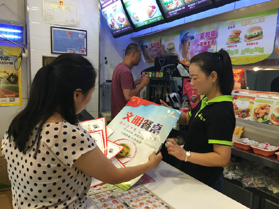 8月29日上午,南关办事处、食品药品监督所开展“文明餐桌”宣传活动,在南关街积极宣传餐桌文明知识,倡导呼吁节俭用餐、安全用餐、卫生用餐和文明用餐,并向餐饮企业负责人倡议,在经营中不能误导顾客超量点餐,应主动提醒顾客吃多少点多少,对于打包的顾客要主动提供免费环保餐盒。此次活动向我办南关街餐饮店共下发“文明餐桌宣传画共300余份,宣传书50余册