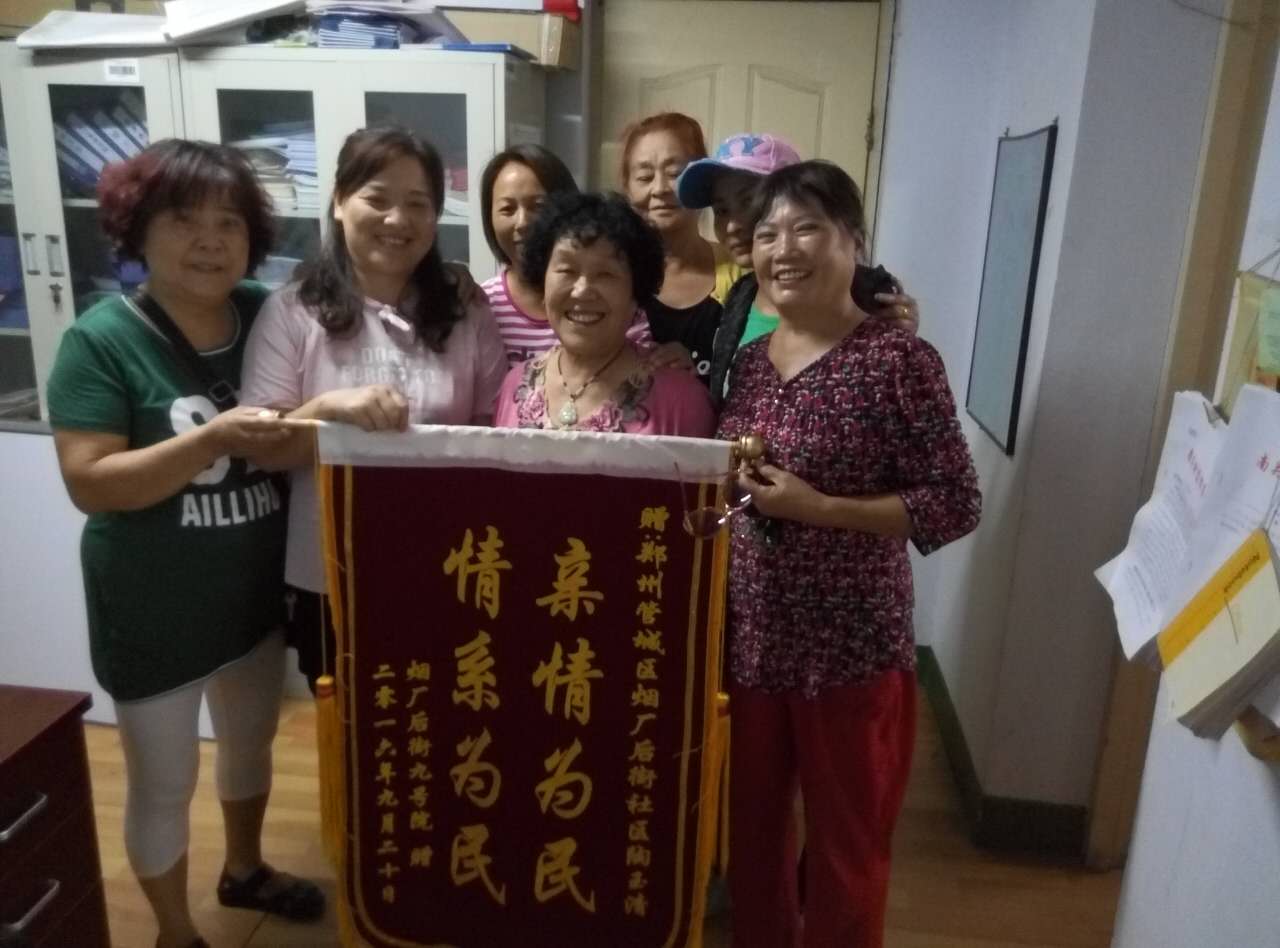 9月22日下午 ,烟厂后街社区9号院居民带着一面“亲情为民,情系为民”的锦旗来到了南关街道办事处烟厂后街社区办公室,衷心感谢社区工作人员,尤其是工作人员陶玉青(负责后街9号院)。陶玉青同志自上任以来工作尽职尽责,全心全意服务群众,每天都到院内打扫卫生,并自费将院内破损路面修复;当听到居民反映院内经常丢失电动车时,陶玉青就开始征求院内群众商讨在院内安装摄像头事宜,得到群众认可后,开始找商家安装,最后并将收取剩余的钱将整个院内楼层的照明灯重新走线安装。得到了大家的一致好评。