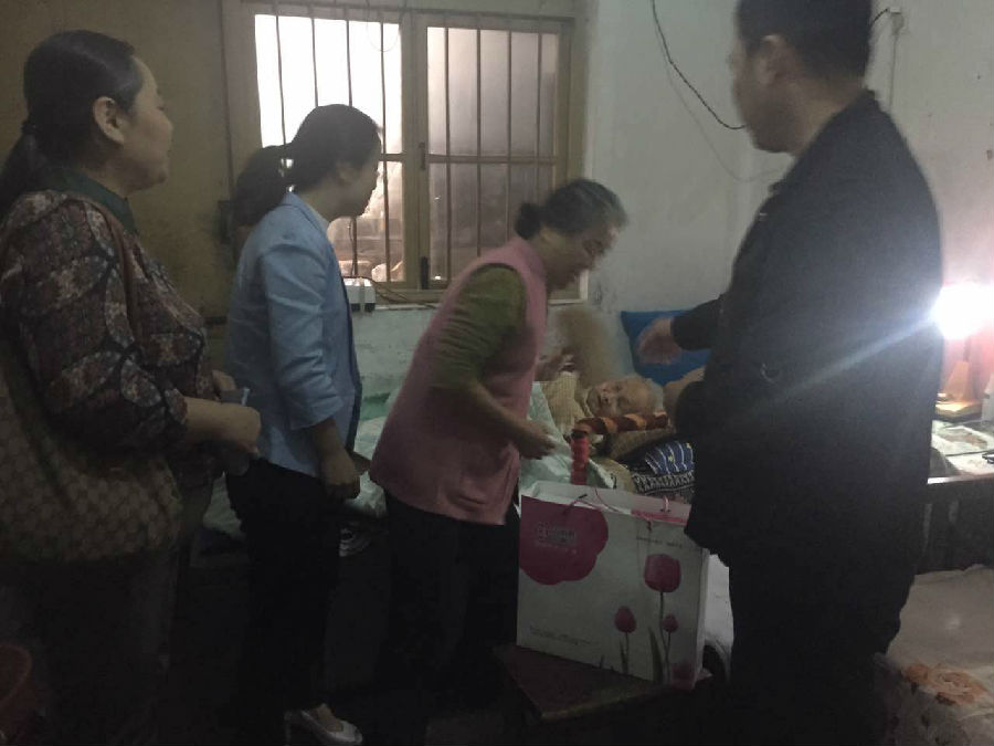 九九重阳节,浓浓敬老情。敬老、爱老是中华民族的传统美德,在重阳节来临之际为弘扬“尊老、敬老、爱老、助老”的优良传统,9月30日上午,南关街办事处副主任张黎娟及烟厂后街社区主任刘华陪同区民政局、宣传部及慈善部门领导到我辖区走访慰问102岁百岁老人芈玉梅,解了老人生活、身体等情况,并送上了重阳节慰问品和慰问金,并祝福她健康长寿。