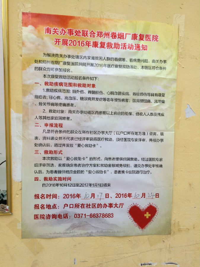 为解决辖区内家庭贫困人群看病难、看病贵的问题,南关办事处依托烟厂医院做好辖区内低保、低收入、残疾人等弱势群体的康复救助活动。为了从严从实做好居民情况摸底工作,确保信息真实和准确无误,融荫网格积极做好宣传工作,在辖区楼院显要位置张贴通知,对于已拆迁搬离的贫困人员,社区工作人员采取日常电话联系并周六周日上户通知等方式,确保做到救助工作宣传到户。