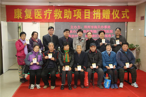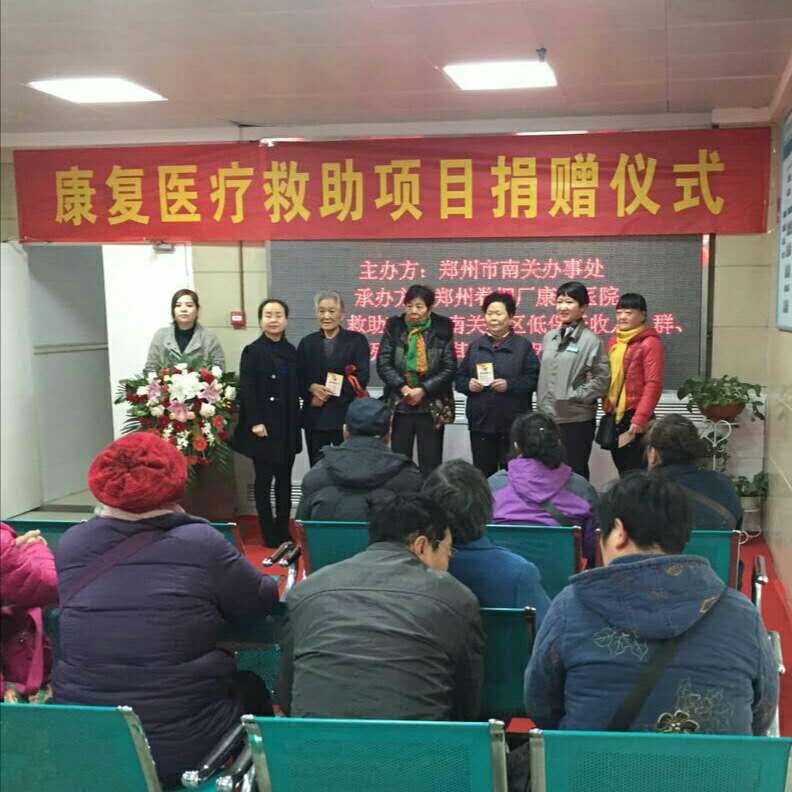 11月2日,由南关街道办事处主办、郑州卷烟厂康复医院承办的2016年南关辖区低保低收入人群、残疾及其他家庭困难者康复医疗救助项目捐赠仪式在郑州卷烟厂康复医院举行。南关办事处副主任张黎娟、烟厂康复医院院长张惠丽、副院长简伟、任化立以及患者代表等百余人共同出席了本次仪式。仪式上,张黎娟副主任和院方代表为21名救助患者颁发了爱心救助卡。张惠丽院长表示,南关办事处和康复医院共同开展2016年医疗康复救助活动,共同实施两结合模式的康复救助行动。南关办事处为医院搭建救助平台,将医院的救助行为纳入到有规范、有监管、有公信力的统一组织中。通过两结合模式的医疗救助,帮助解决贫困人口和社会弱势群体当中重症、疑难症患者,使患者真正享受到南关办事处和郑州卷烟厂康复医院的善举。此次爱心救助活动将持续到明年3月份,凡符合条件的群众均可到所在社区办事大厅进行咨询。