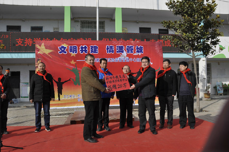 1月19日上午,郑州市教育局联合郑州市文明办,管城区文明办、管城区教育体育局在十八里河镇柴郭小学举办“文明共建 情满管城”乡村少年宫捐赠活动。郑州市文明办副主任薛土岭,郑州市教育局实验教学装备管理中心主任张冬磊、党支部书记孙迎红,管城区文明办主任吴俊江、管城区教体局党组副书记张哲以及管城区8所乡村学校少年宫的教师代表和柴郭小学部分师生共300余人参加了捐赠活动。