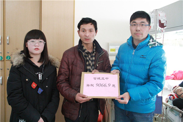 得知这一消息后,管城三中春蕾志愿社团向全校师生发出倡议,为龙帅嘉同学捐款治病。一周的爱心传递,全校师生和志愿者共募捐善款9066.9元。这笔善款于2017年1月15日已送到省人民医院龙帅嘉父母手中。
