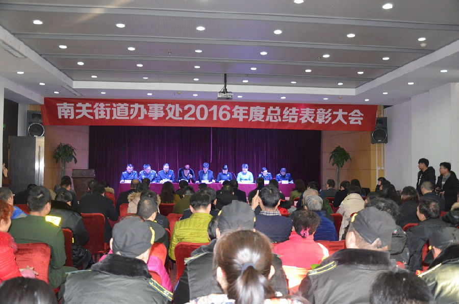 2月10日上午,南关街道办事处在世贸大户中心召开2016年度总结表彰大会。会议由南关街道党工委副书记、办事处主任赵玉同志主持,街道党工委副书记车伟红同志宣读《关于对2016年度区考核优秀等次人员做出表彰的决定》、《关于对2016年度优秀科室、优秀社区以及优秀个人表彰的决定》、《关于对2016年度辖区先进单位和先进个人表彰的决定》和对13名商都历史文化区起步区书院街征迁工作先进个人的表彰。并对河南银基房地产开发有限公司等23个先进单位、姐弟俩土豆粉等5个优秀商户以及王慧等55名先进个人予以表彰。先进单位代表世贸购物中心经理马召明同志、先进社区代表周非同志以及先进个人代表马美霞同志先后进行了发言。