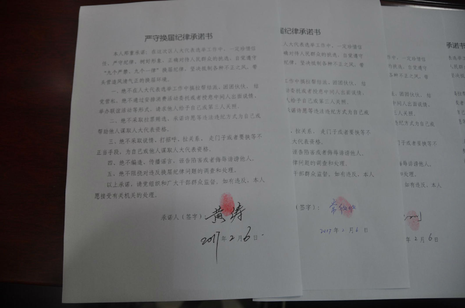 会议结束后,代表候选人签订了以“九个严禁、九个一律”为主要内容的严守换届纪律承诺书。