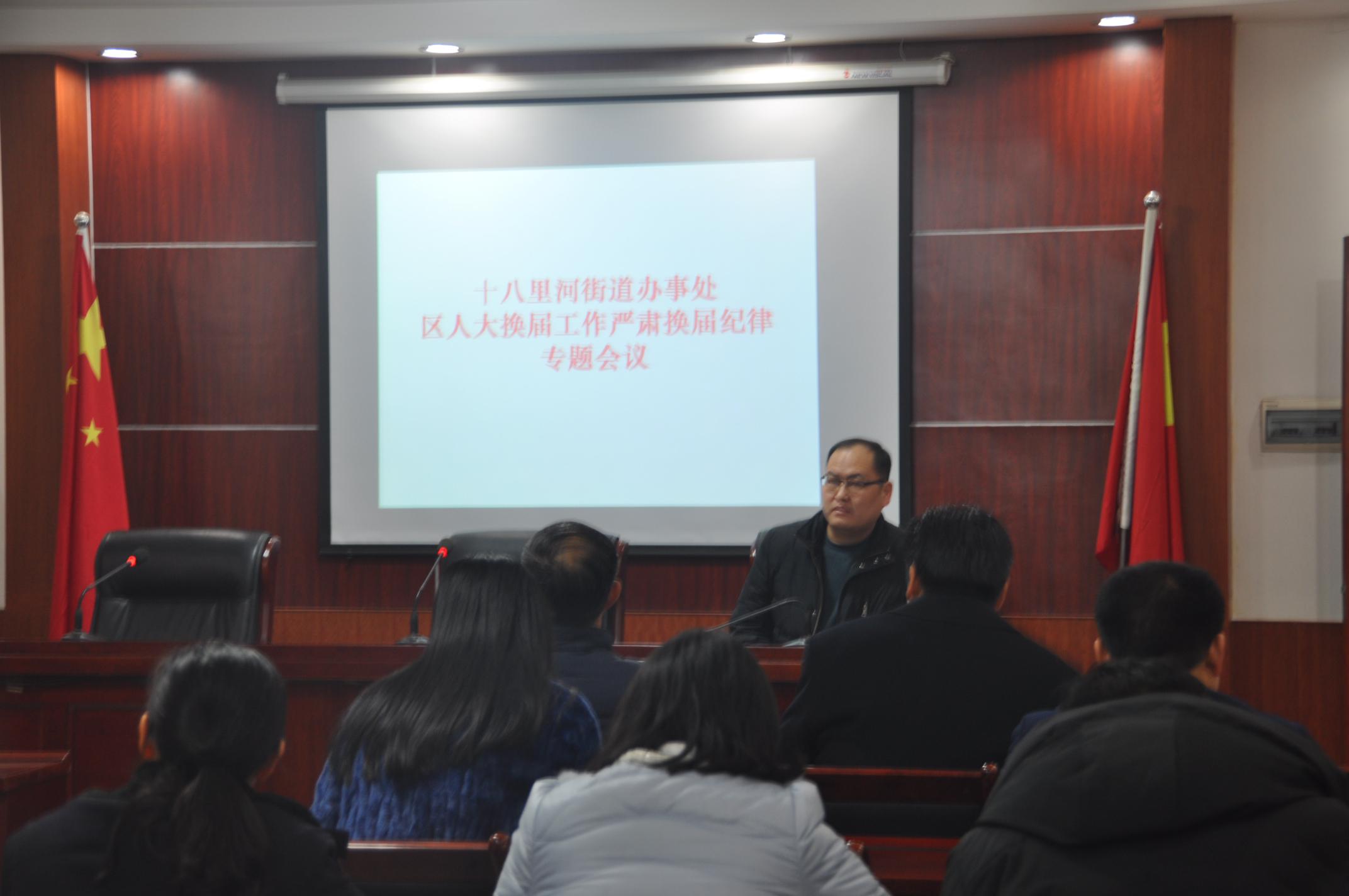 2月6日上午,十八里河街道办事处以“严格遵守换届纪律、确保换届风清气正”为主题,召开了由区人大代表初步候选人参加的区人大换届工作严肃换届纪律专题会议,重申市、区严肃换届纪律规定要求,引导和督促候选人自觉遵守换届纪律,自觉做到换届期间思想上不波动、精神上不滑坡、工作上不松劲,把纪律和规矩挺在前面,以铁的纪律确保换届平稳有序,风清气正。会议由十八里河办事处主任王子慧主持。
