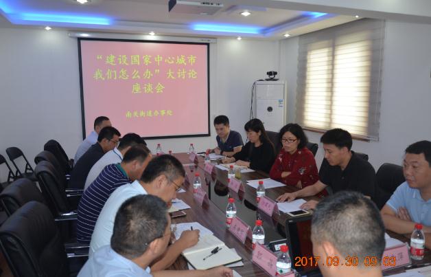 9月30日上午,南关街道办事处在四楼会议室召开“建设国家中心城市我们怎么办”大讨论座谈会,区委宣传部长杨洁出席会议。会议由街道党工委书记沙建武主持,参会人员有街道班子成员、辖区人大代表、政协委员、党员代表等15人。