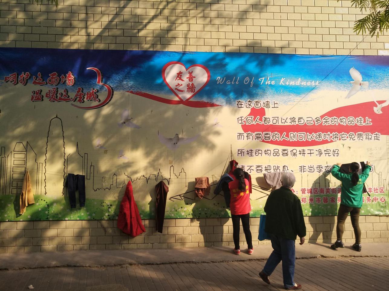 虽说天气寒冷,但是阳光普照着大地。党员志愿者许艳莉阿姨手拿着居民爱心捐赠的衣服正挂在社区里的温暖之墙--友善之墙上,每天不断更新着墙上的衣物,为那些需要的人群提供着支持和帮助,用自己微小的行动来温暖周围的人。