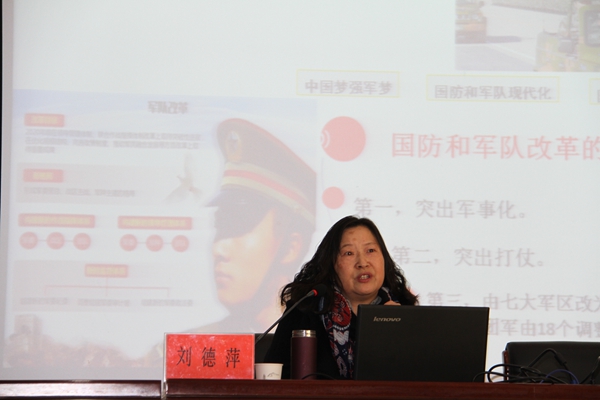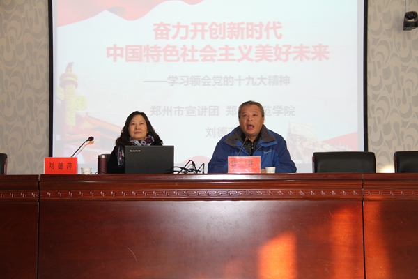 会上,刘德萍作了题为“奋力开创新时代中国特色社会主义美好未来”的报告,刘教授从党的十九大主题,新时代中国特色社会主义的深刻变革、历史使命、理论指导、基本方略、战略部署以及十九大精神在河南落实等方面深入浅出、通俗易懂地解读了十九大精神。整个报告既有理论高度,又有很强的现实指导意义;既深刻生动,又联系实际,特别是党的十九大对教育工作提出的新要求、新任务,在参会人员中引起热烈反响。