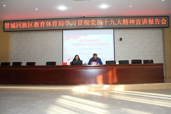 12月21日上午,管城区教体局在外国语小学举办了学习贯彻党的十九大精神宣讲报告会。本次报告会邀请了市委宣讲团成员、郑州师范学院思政部教授刘德萍作专题报告。局机关科室及二级机构负责人、局属各中小学校长、幼儿园园长、中心校校长及辖区学校校长,各支部书记、副书记和3名党员代表共计230余人参加会议。会议由管城区教体局党组副书记张哲主持。