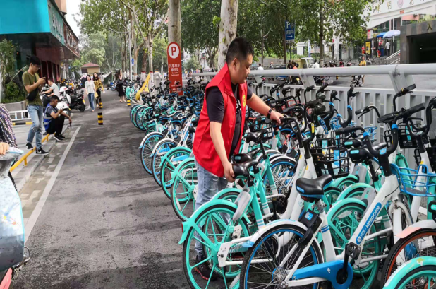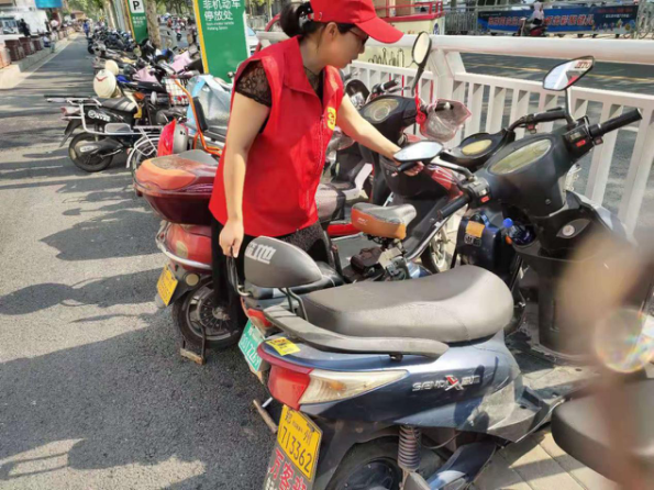 志愿者们将倒地和乱停乱放的共享单车和电动车等一辆辆扶起并摆放整齐,使之合理安全,有序停放,提升城市环境形象,营造优雅环境氛围。