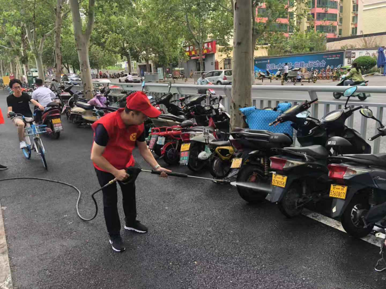 头戴小红帽,身穿红马甲,积极主动清理散落在地上的垃圾纸屑,对周边道路乱停乱放的车辆进行搬移规整,用水枪冲洗街道路面,为周边市民营造了一个清洁、惬意的生活环境。