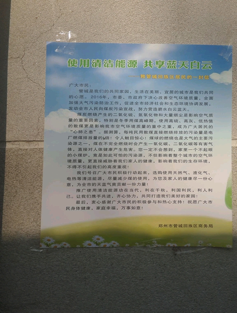 为全面加强大气污染防治工作,促进全市经济社会和生态环境协调发展,发动全区人民向煤炭污染宣战,努力营造碧水白云蓝天。8月26日,管城区商务局赶制近万份宣传海报,组织各乡(镇)办事处和单位人员到居民楼及人流集中区域张贴《致管城回族区居民的一封信》,向居民宣传煤炭燃烧对环境破坏的知识,号召广大市民选购使用天然气、液化气、电磁炉等清洁燃料,减少民用煤的使用。
