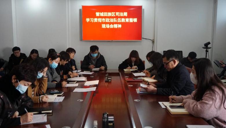 贯彻落实上级会议精神:管城回族区司法局在局会议室学习贯彻市政法队伍教育整顿现场会精神。党组书记、局长白刘军对市政法队伍教育整顿现场会精神进行了传达,并强调了以下要求:坚持做到人民信得过、靠得住的政法队伍,把握好标杆。做好贯穿始终,一学习教育是开路先锋,贯穿始终,二查纠问题要贯穿教育活动始终。走深走实走在前面,正确认识督导组条块结合督导,出现氛围不浓、行动滞后的情况,及时发现问题、整改迎头赶上。针对学习教育进行深化,各所结合自身做好学习资料留存和档案整理。接下来各部门统筹条块,律师、矫正、公共法律服务要拿出方案,主动对接,多讨论。