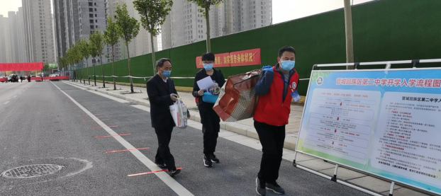 在学校门口,返校学生的所有行李由学校统一组织消杀,并统一安排人员派送到宿舍。学生在测量体温后依次入校,整个返校流程科学规范,做到了安全可控。