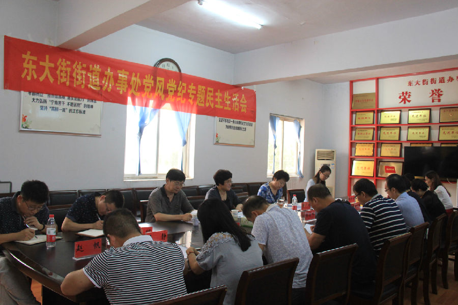 8月19日上午,东大街街道在二楼会议室召开以“严守党规党纪、做忠诚干净担当合格党员”为主题的领导班子党风党纪专题民主生活会,常务副区长张艳敏、副区长郭万全及区纪委、区组织部的相关人员参加了会议。